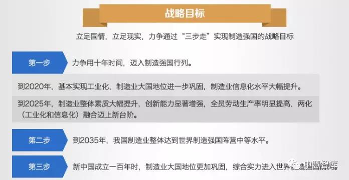 为实现从“制造大国”到“制造强国”的转变,2015年,中国出台了《中国制造2025》,明确提出,“以加快新一代信息技术与制造业深度融合为主线”,分“三步走”建设制造强国的战略目标: