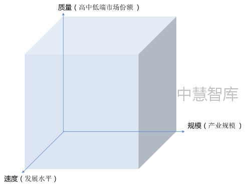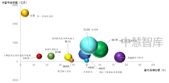 图例说明:(1)横座标轴代表各领域所包含的目标产品在中国市场上国内品牌份额的加权值;(2)纵座标轴代表各领域目标产品的中国市场规模的总和;(3)球形大小代表各领域目标产品的中国市场中国内品牌所占据的市场规模;(4)各球不同颜色代表不同的领域,具体颜色说明如下: