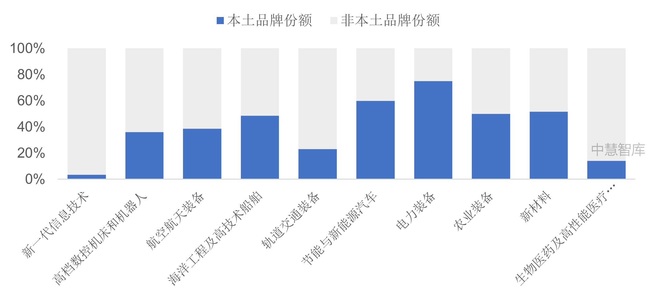 一是新一代信息技术产业链关键环节市场规模最大,达到8000亿以上,但国内品牌市场额最低,只有3.35%。