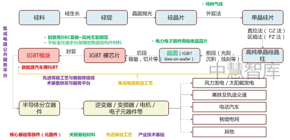 IGBT产业链包括上游硅料、半导体硅片、晶圆加工等,IGBT生产如设计、芯片制造、模块、封装等,也可能采用IDM方式,以及IGBT下游应用,还包括各种生产设备制造。近年来,国家产业政策针对产业基础也给予了一定支持。
