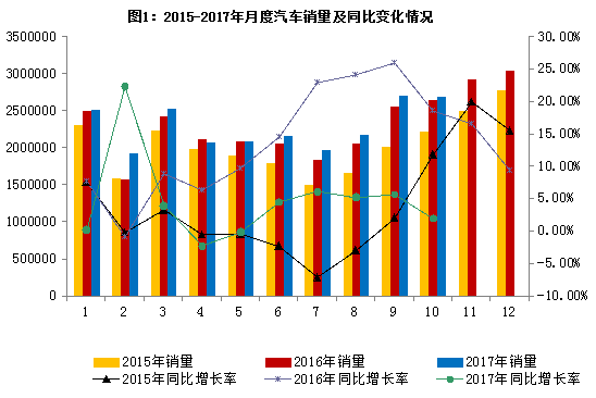 2017年10月,汽车产销同比保持增长,环比小幅下降。1-10月,汽车产销保持小幅增长,增速较前三季度稍有回落。