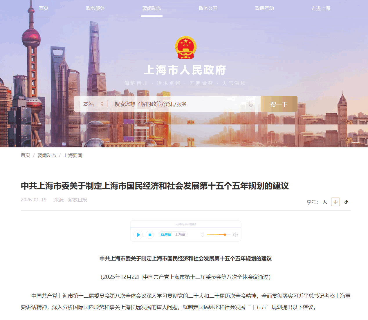 1月19日,《中共上海市委关于制定上海市国民经济和社会发展第十五个五年规划的建议》(以下简称《建议》)全文正式发布。《建议》明确,“十五五”期间(2026年-2030年),上海将以先进制造业为骨干,构建“2+3+6+6”现代化产业体系,打造世界级高端产业集群,打响“上海制造”品牌。
