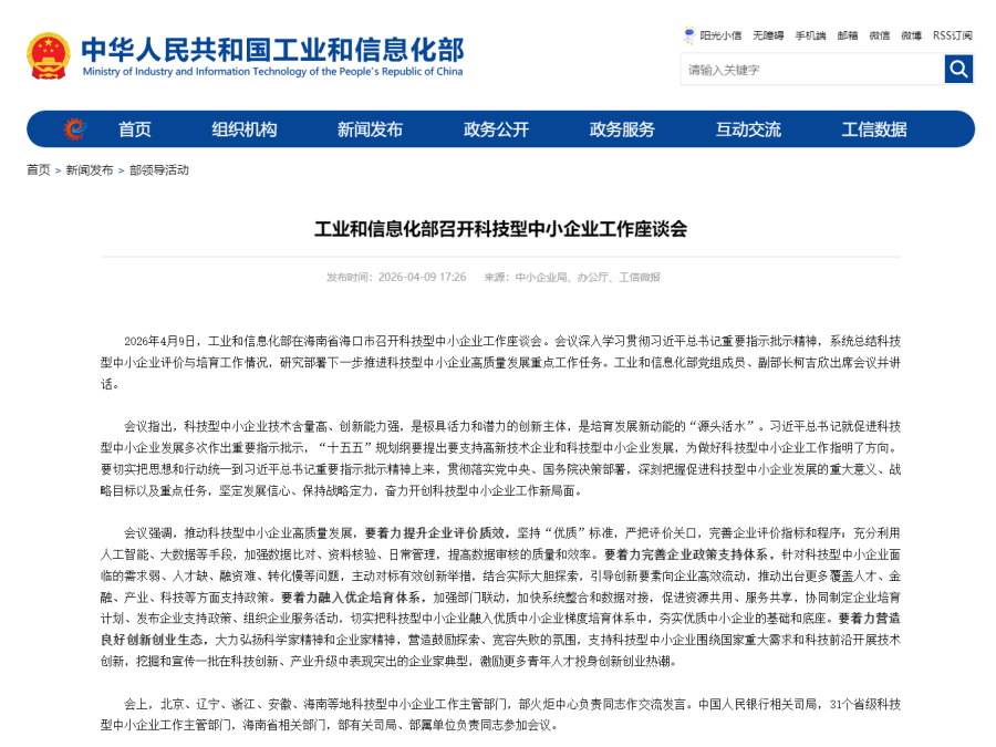 2026年4月9日,工业和信息化部在海南省海口市召开科技型中小企业工作座谈会。会议深入学习贯彻习近平总书记重要指示批示精神,系统总结科技型中小企业评价与培育工作情况,研究部署下一步推进科技型中小企业高质量发展重点工作任务。工业和信息化部党组成员、副部长柯吉欣出席会议并讲话。