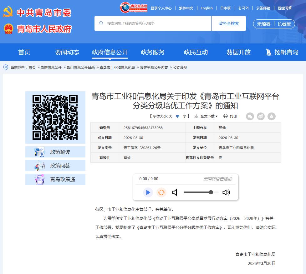 青岛将面向全市工业互联网平台开展分级分类综合评价