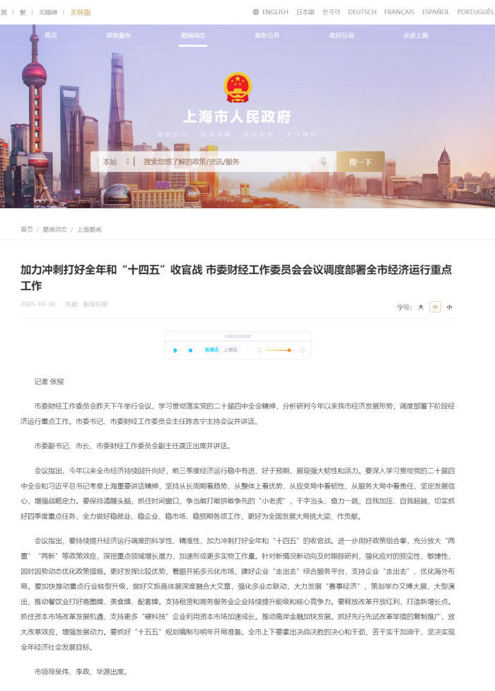 加力冲刺打好全年和“十四五”收官战 上海市委财经工作委员会会议调度部署全市经济运...