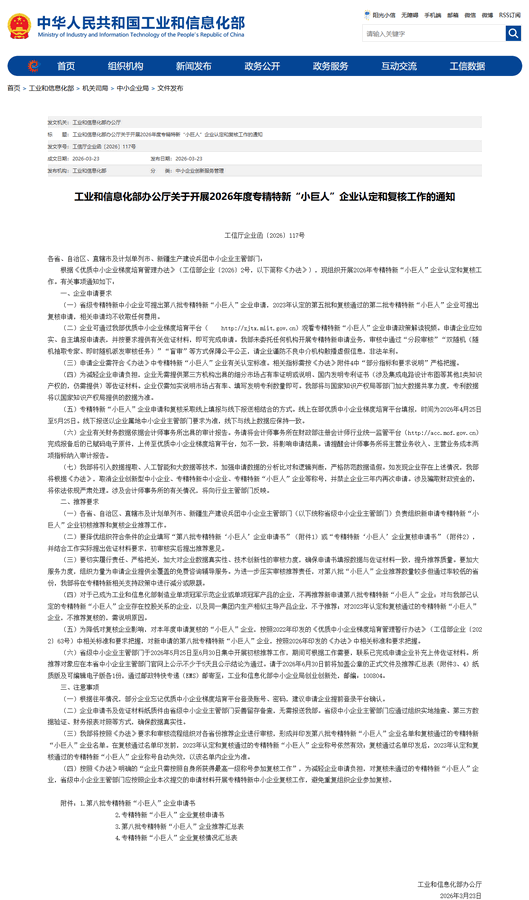 工信部:2026年度专精特新“小巨人”企业认定和复核工作启动