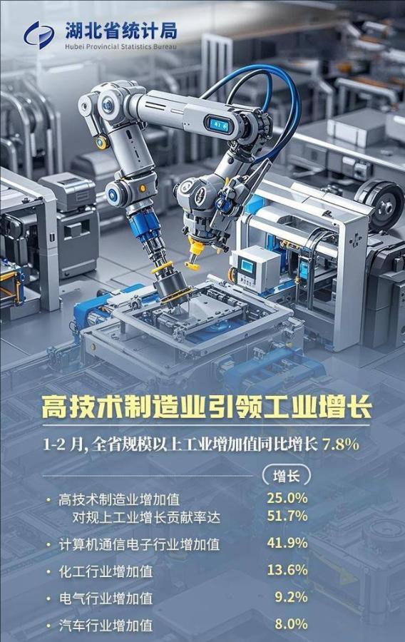 高技术制造业增长25% 对工业贡献率超五成 前两个月湖北经济开局良好