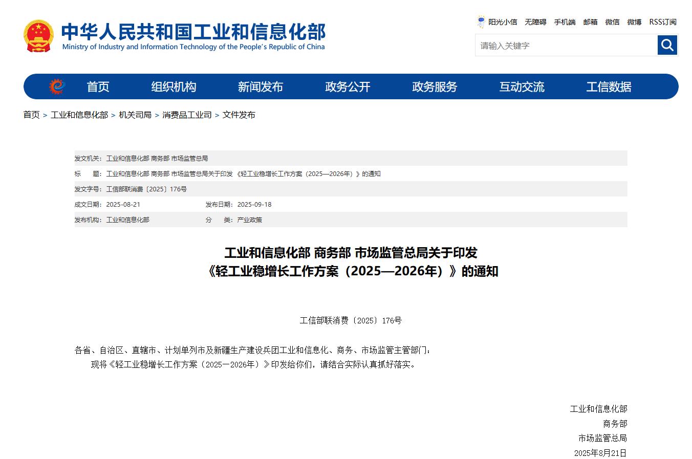 三部门印发轻工业稳增长工作方案 助力行业持续回升向好